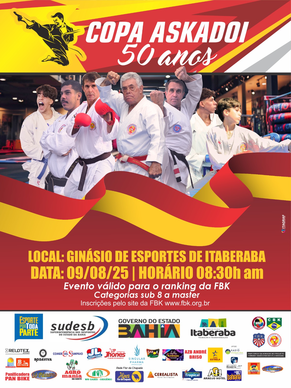 A ASKADOI em parceria com a Federação Baiana de Karatê, realizará no dia 09 de agosto a COPA ASKADOI 50 ANOS, que faz parte das comemorações dos 50 anos do Karatê em Itaberaba.
