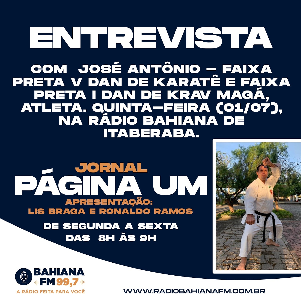 ENTREVISTA COM O SENSEI JOSÉ ANTÔNIO Por Askadoi - 27 de junho de 2021 0 374 Dia 01/07 às 8:00 horas na Rádio Bahiana FM. Um bate papo sobre o Karatê, o KRAV MAGÁ e KAPAP, sistema de defesa pessoal e combate corpo a corpo israelense.